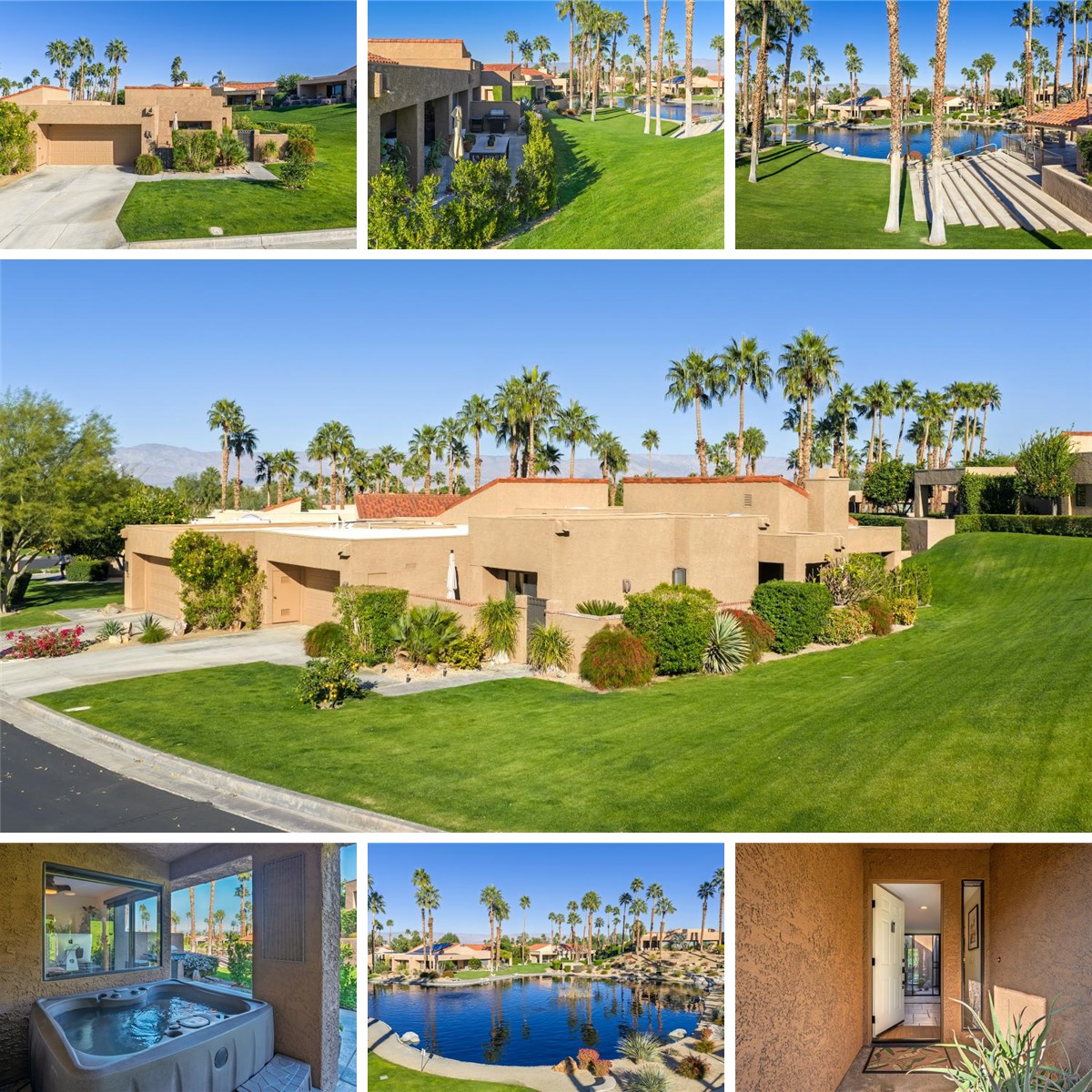 Picture a shimmering lake nestled in the heart of the desert. It is not an illusion, but one of Ironwood's most coveted treasures, rarely available and ready for you to claim. This fully remodeled two-bedroom, two-bath retreat boasts sweeping lake vistas and breathtaking mountain views from the master suite. Step onto the extended patio, where you can soak in the scenery or unwind in your private jacuzzi. Inside, a tranquil, zen-inspired ambiance welcomes you, perfectly capturing the relaxed spirit of desert living. Expansive green spaces stretch beyond your windows, creating a sense of openness and freedom. Every detail has been thoughtfully upgraded, from elegant tile floors and gleaming granite countertops to custom cabinetry, modern appliances, and unique touches such as a stone-accented fireplace and a glass-block shower in the master bath. Additional upgrades include a complete home security system, automated blinds, a patio misting system for year-round comfort, along with newly desertscaped landscaping and a serene atrium that brings natural light and architectural interest into the home. Sunlight pours through large windows and doors, illuminating the fresh, contemporary palette throughout. This home has been meticulously transformed with quality finishes at every turn. Make it yours and experience a lifestyle that exceeds expectations.