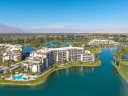 You will enjoy a very open floor plan with newer wide plank tile floors leading out to covered terrace with gorgeous views. The very modern open kitchen has a clean and fresh look with Pental Quarts counters, General Electric stainless appliances, a Sharp Microwave Drawer, w Wine refrigerator built-in to Shaker style cabinetry. The living area contains a stacked stone fireplace wired for a flat Screen television. All of the lighting in the home is LED square times lights and designer style pendant chandeliers. Walking onto the very large patio you have a wonderful southeast view of the lake, golf course and mountains. A perfect place for morning coffee. Both baths have been completely remodeled with high hung vanities and quartz countertops. The showers contain handmade subway tiles with frameless glass surrounds and Koehler Ladena Faucets. Desert Island stands as a distinctive high-rise condominium community on a lush, 25-acre private island encircled by a sparkling lake and a lush green 18-hole championship golf course. Residents enjoy beautifully landscaped park-like grounds with walking paths, fruit trees, seating areas, tennis and pickleball courts, heated swimming pools and spas, pedal boats, fishing facilities, and secure 24-hour guard-gated entry. The HOA fees cover on-site management, central air-conditioning, water, gas, trash, Spectrum cable TV, Wi-Fi Internet, and the maintenance of landscaping and common areas, providing a low-maintenance, carefree lifestyle. Conveniently located close to shopping, dining, theaters, galleries, and casinos, with easy access to Eisenhower Medical Center. Schedule your showing today and discover why this home is not just a property, but a place to create lasting memories!