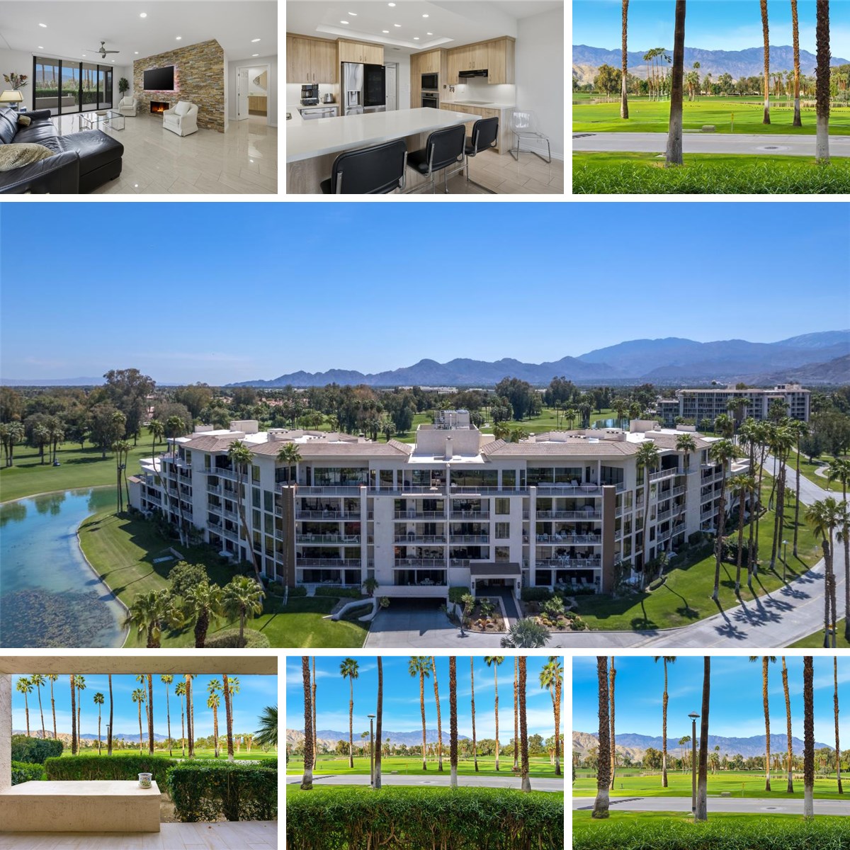 This spacious popular dual primary-bedroom suite floor plan has been completely renovated for both style and functionality. Throughout the home every room enjoys spectacular mountain views through 9-foot windows leading out to a covered terrace, ideal for relaxing. The formal entry and living room feature striking stacked stone walls and cozy gas fireplace is outfitted with Dynamic-backlit 70-inch LG TV. You will appreciate the many upgrades including porcelain tile flooring throughout, gorgeous kitchen featuring a convenient breakfast bar, contemporary custom cabinetry with abundant storage, beautiful quartz counters deliver a sleek modern aesthetic, built-in stainless-steel appliances, and custom lighting. The HVAC system is 6-months new and features a smart Nest thermostat. Additional upgrades include Kasa switches, compatible with both Alexa+ and Google, which allow for easy voice-operated control of lighting and other smart devices. Desert Island stands as a distinctive high-rise condominium community on a lush, 25-acre private island encircled by a sparkling lake and a lush green 18-hole championship golf course. Residents enjoy beautifully landscaped park-like grounds with walking paths, fruit trees, seating areas, tennis and pickleball courts, heated swimming pools and spas, pedal boats, fishing facilities, and secure 24-hour guard-gated entry. The HOA fees cover on-site management, central air-conditioning, water, gas, trash, Spectrum cable TV, Wi-Fi Internet, and the maintenance of landscaping and common areas, providing a low-maintenance, carefree lifestyle. Conveniently located close to shopping, dining, theaters, galleries, and casinos, with easy access to Eisenhower Medical Center. Schedule your showing today and discover why this home is not just a property, but a place to create lasting memories!